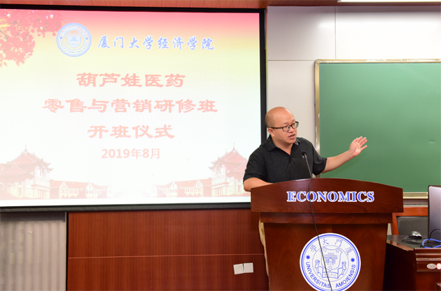 在开班仪式上,廖景峰主任首先代表厦门大学经济学院热烈欢迎龙8医药零售与营销研修班的学员到厦大学习,并就厦门大学及经济学院的相关情况进行了介绍。他说,龙8学员走进厦大就是厦大的校友,希望未来的日子能够关心、支持母校的发展,多提宝贵意见,同时他也祝大家在厦大学习期间学有所成、学有所获。