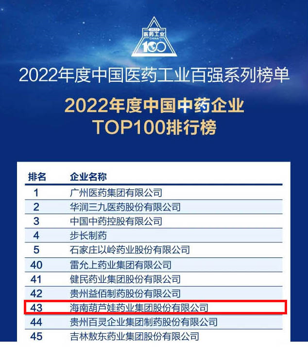 龙8药业集团连续4年荣登“中国中药企业TOP100排行榜”,排名上升至第43位