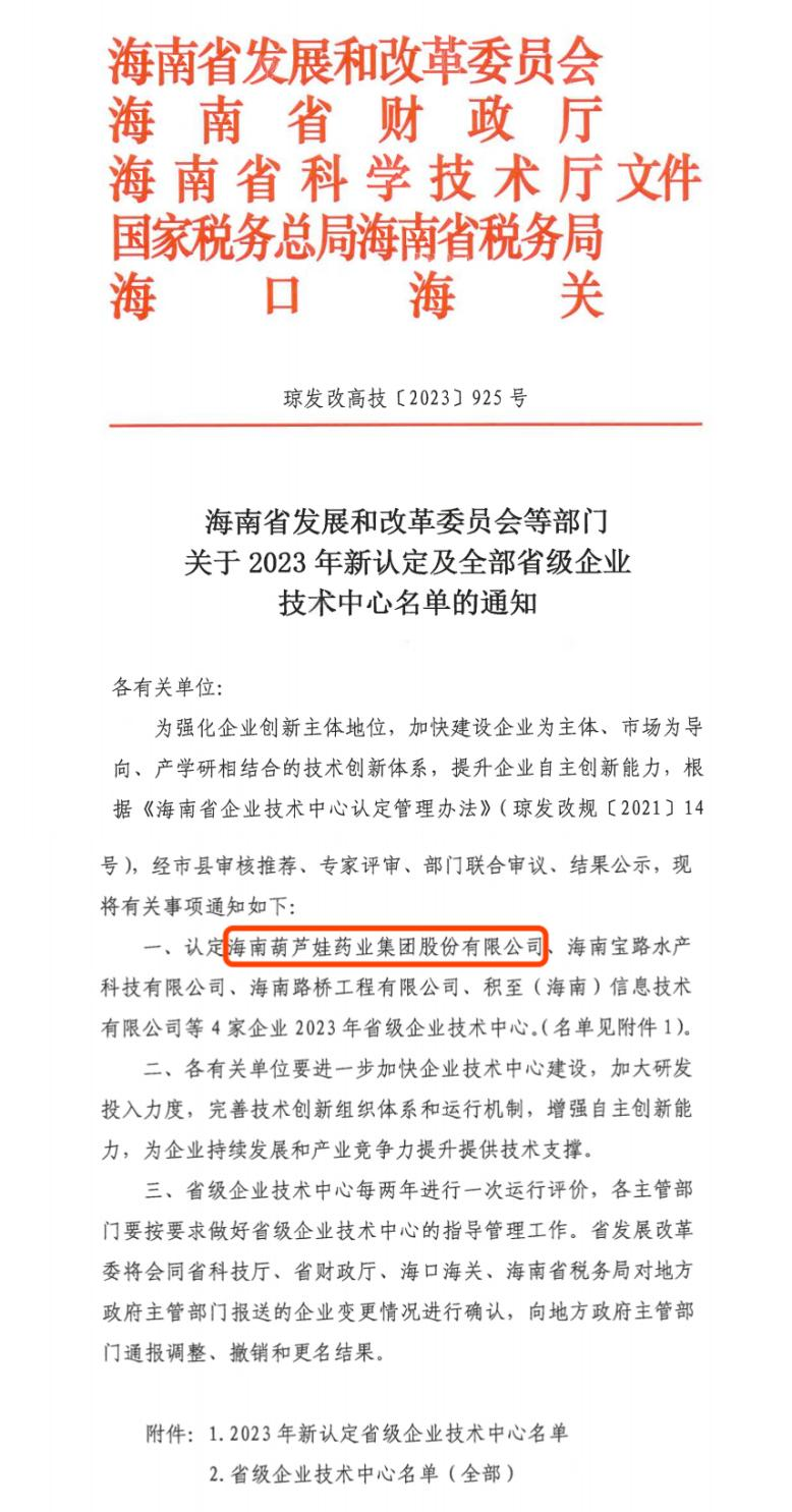 近日,海南省发改委等多部门联合公布了《关于2023年新认定及全部省级企业技术中心名单的通知》,其中,海南龙8药业集团股份有限公司成功通过评审,被认定为省级企业技术中心,是本次获批的4家企业之一。